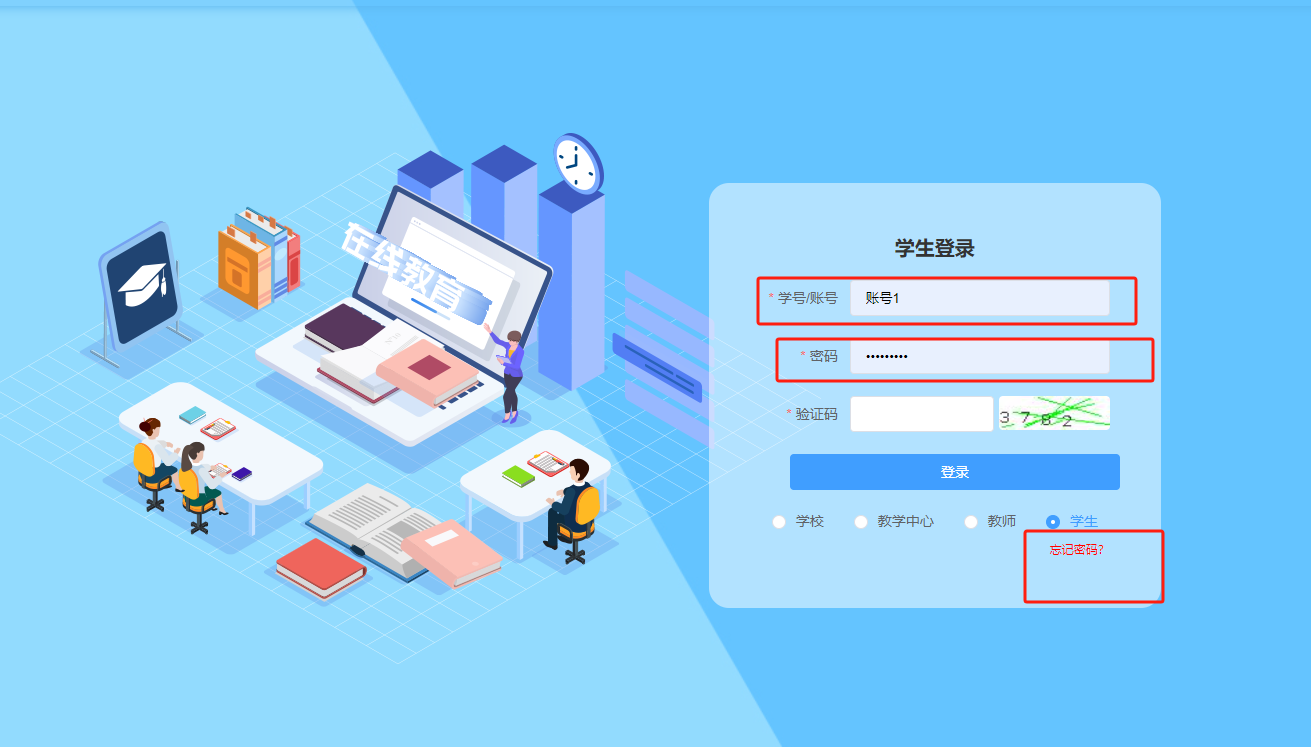 选择“学生登录”,输入学号和密码进行登录,如忘记密码,点击登录页面“忘记密码”进行密码的修改