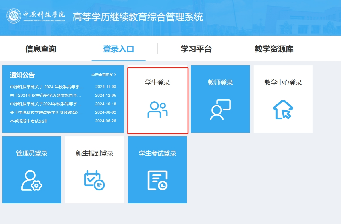 打开学校高等学历继续教育综合管理系统网址:https://zykj.jijiaox.com/jw/index.html